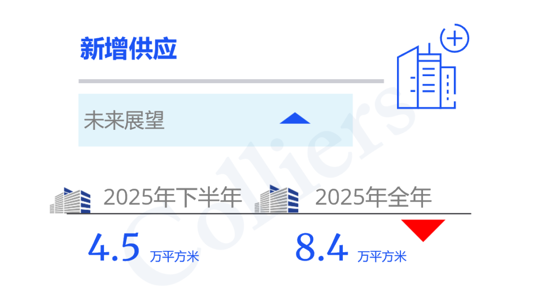 2025年下半年,杭州甲级写字楼市场迎来2处新增供应,均位于武林板块,共计新增约4.5万平方米。2025年全年供应量约8.4万平方米,相较2024年有大幅回落。