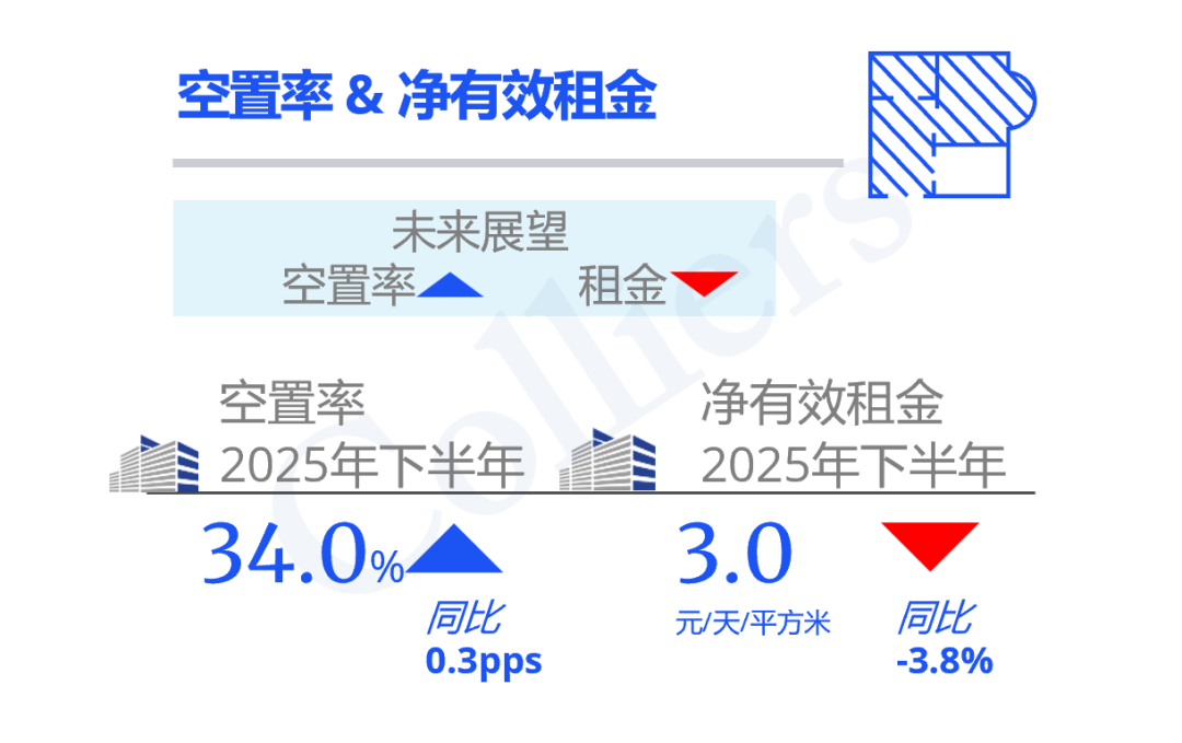 受新增供应与有限需求的结构性失衡影响,整体空置率环比上升1.2个百分点至34.0%,攀升至近七年以来的历史高位。